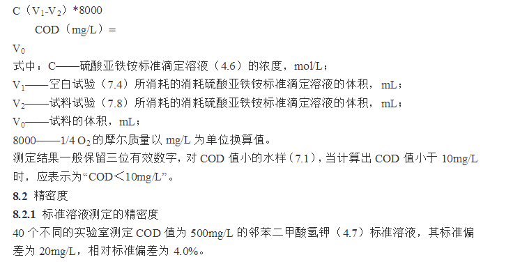 7.6 校核试验:按测定试料(7.8)提供的方法分析20.0m L邻苯二甲酸氢钾标准溶液(4.7)的COD值,用以检验操作技术及试剂纯度。