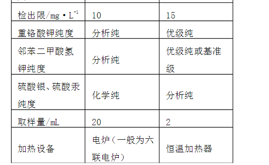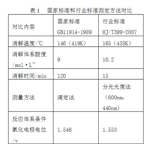 由于化学需氧量的测定一个条件性试验,在200℃以下很难保证将大部分有机化合物消解完全,综合地说,对一般有机化合物的氧化率能达到90%以上,但能达到100%的为数却不多(如邻苯二甲酸氢钾)。现将*家标准和行业标准的测定条件进行对比,如表1所示。