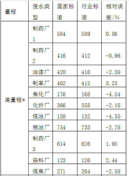 河北省环境监测中心站曾分别采用*标法和行标法对不同类型的废水水样分低量程和高量程进行了对照实验,数据如表2所示[5]。