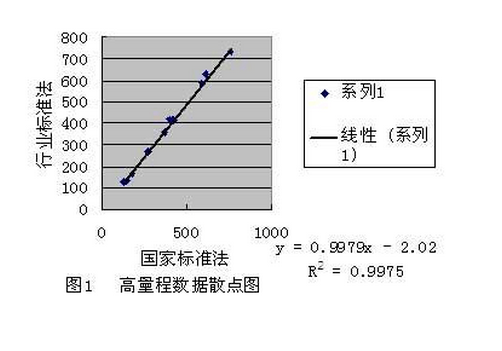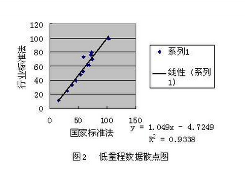 我们将*标法和行标法的高量程和低量程的对照数据分别制成散点图,如图1和图2所示,同时对散点图进行线性处理,其相关系数R2分别为0.9975和0.9338,即R值分别为0.9987和0.9663,对于自由度分别为10和12的高量程和低量程的数据,相关系数R的临界值分别为0.5760和0.5234(α=0.05),说明两者线性相关关系是比较好的。在线性方程Yi = aXi+b中,高量程和低量程的系数a分别为0.9979和1.049,也说明两组数据(Xi和Yi)是比较接近的。