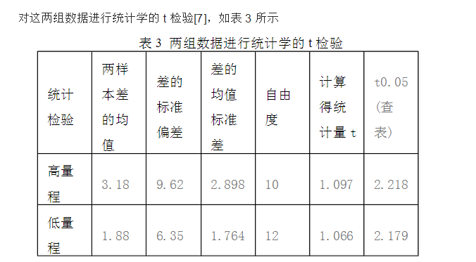 由t检验可以看出,高量程数据的统计量t=1.10<2.218 =t0.05(10),低量程数据的统计量t=1.07<2.179 =t0.05(12),证明两种量程的两组数据无显著性差异。