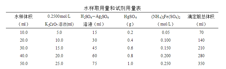 注:①对于化学需氧量高的废水样,可先取上述操作所需体积1/10的废水样和试剂,与15mm×150mm硬质玻璃试管中,摇匀,加热后观察是否变为绿色。如溶液显绿色,再适当减少废水取样量,知道溶液不变绿色为止,从而确定废水样分析时应取用的体积。稀释时,所取废水样不得少于5ml,如果化学需氧量很高,则废水样应多次逐级稀释。