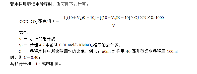 4.7 若水样用蒸馏水稀释时,需另取100ml蒸馏水,按步骤4.2~4.5测定空白值,记录消耗的0.01 mol/L KMnO4溶液的毫升数V0。