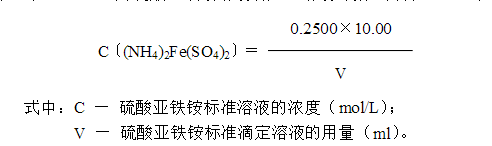 8.7 每次实验时,应对硫酸亚铁铵标准滴定溶液进行标定,室温较高时尤其应注意其浓度的变化。标定方法亦可采用如下操作:于空白试验滴定结束后的溶液中,准确加入10.00ml、0.2500mol/L重铬酸钾溶液,混匀,然后用硫酸亚铁铵溶液进行标定。