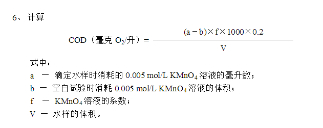 4.6 KMnO4溶液校正系数的测定:取步骤4.5滴定完毕的水样,用滴定管加入10ml(0.01 mol/L)Na2C2O4溶液,再用0.01 mol/L KMnO4溶液回滴**溶液呈微红色。记录相当于10ml(0.01 mol/L)Na2C2O4溶液的KMnO4溶液的毫升数V2,则KMnO4溶液的校正系数K=10/ V2。