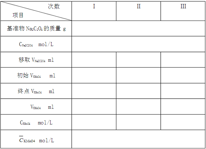 准确称取0.1675g经105~110oC烘干**恒重的Na2C2O4于小烧杯中加150mL蒸馏水溶解冷却后转移**250ml容量瓶中,定容,摇匀。 2. 0.002mol/L KMnO4溶液的配制及标定