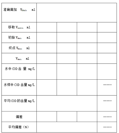 用移液管准确移取100.00ml水样,置于250ml锥形瓶中加5ml 1:3 H2SO4,用滴定管准确加入10.00ml 0.002mol/L KMnO4溶液,摇匀。将锥形瓶放在电炉子上加热**沸腾,并持续30min。取下锥形瓶,用移液管移入10.00ml Na2C2O4标准溶液、摇匀,溶液由红色变为无色,再移入10.00ml Na2C2O4标准溶液,摇匀。趁热用0.002mol/LKMnO4标准溶液滴定**刚出现粉红色,并保持30s不褪色,即为终点。记录数据。 4.空白样耗氧量的测定