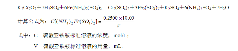 标定方法:准确吸取10.00mL重铬酸钾标准溶液于250mL锥形瓶中,加水稀释**110mL左右,缓慢加入30mL浓硫酸,混匀。冷却后,加入3滴试亚铁灵指示剂,用硫酸亚铁铵溶液滴定,溶液的颜色由黄色经蓝绿色**红褐色即为终点。反应方程式为: