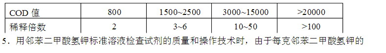 4.对于化学需氧量小于50mL的水样,应改用0.0250mol/L重铬酸钾标准溶液,回滴时用0.01mol/L硫酸亚铁铵标准溶液;而当化学需氧量大于500时,要进行稀释,建议稀释倍数如下表: