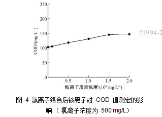 变,COD 明显增加。因此,当水样中存在氯离子时,铵离子可对 COD 的测定产生正干扰。