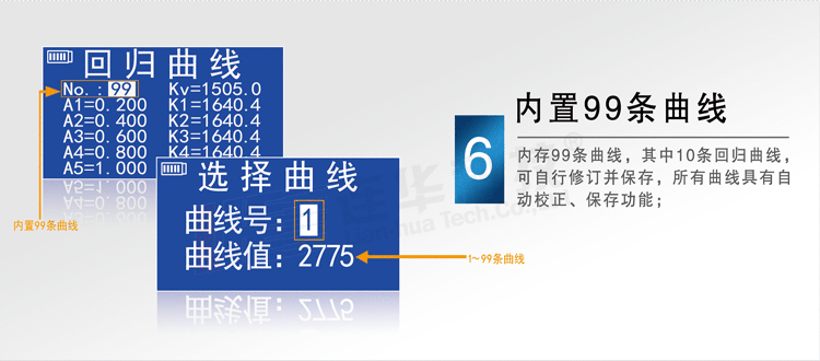 (07) 内存99条曲线,其中10条回归曲线,可自行修订并保存,所有曲线具有自动校正、保存功能;