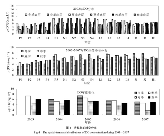 溶解氧含量的季节分布顺序为:冬季(均值为 5.97mg·L -1 )>春季(均值为 5.83 mg·L -1 )>秋季(均值为 5.31 mg·L -1 )>夏季(均值 4.01 mg·L -1 ) ,季节差异明显(见图 4) 。广州海域 DO 季节分布受温度影响明显,冬季温度**低,DO 含量则**高,夏季温度**高,DO 含量则**低;而春、秋季温度差异不大,DO 差异可能与水交换状况及污染物耗氧程度有关,春季珠江径流量大,水力搅动作用明显,水体中 DO 含量较高。DO 均值的年际变化范围为4.59~6.05 mg·L -1 ,2003 - 2006 年 DO 含量逐年下降, 2007 年比 2006 年则略有上升, 与 COD 变化情况略有不同,主要是水体中 DO 含量不但受污染物降解耗氧的影响,还受水温、河流径流、水交换条件、生物作用(光合作用和呼吸作用) 、水体中的氧化还原反应(BOD 反应、硝化反应和污染氧化)等多因素的影响 [15] 。